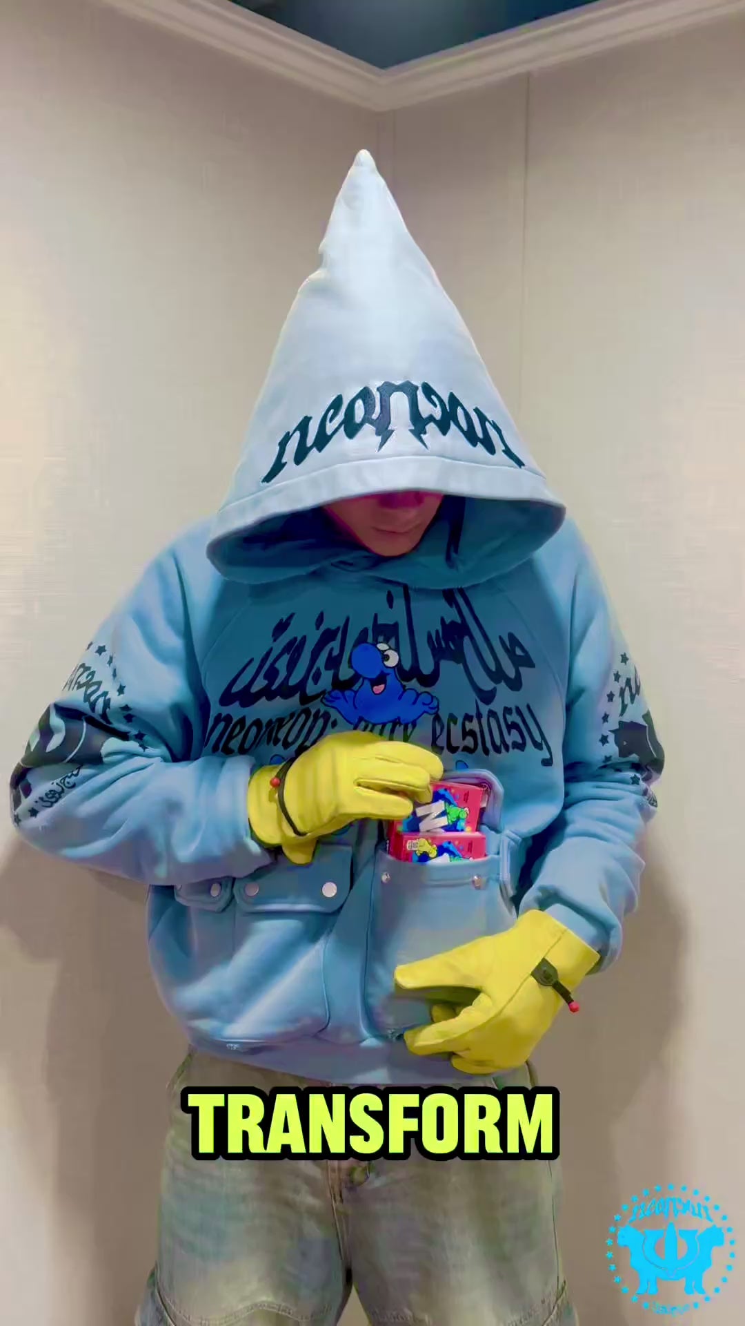 When flipped inside out it transforms to a blank baby blue hoodie